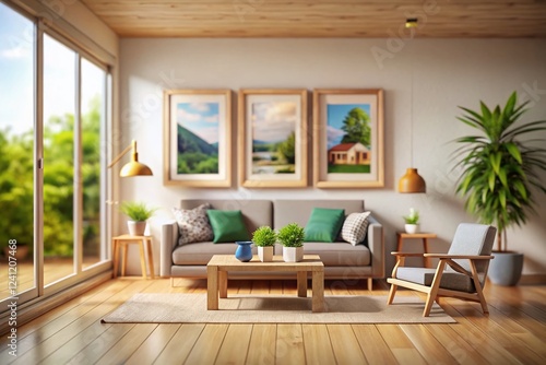 Scandinavian Room Interior Mockup: 3 Wood Frame Photos, Tilt-Shift Effect, 3D Render