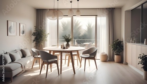 Scandinavian rustic home interior design of a modern living room with grey barrel chairs at a wooden round dining table