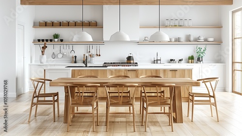 Scandinavian style modern kitchen with a wooden table and chairs on a white background
