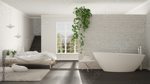 Scandinavian white minimalist bathroom and bedroom, open space, one room apartment, modern interior design