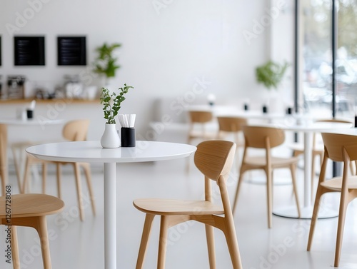 Scandinavianinspired twostory cafe with clean white interiors, light wooden furniture, and soft natural lighting