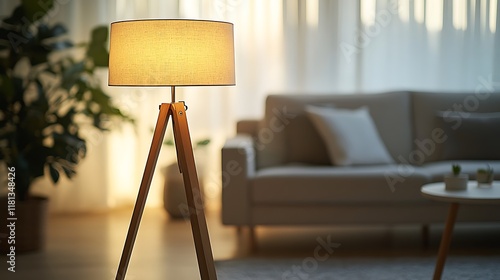 Scandinavianstyle table lamp with a wooden tripod base and a simple white fabric shade placed in a bright and airy bedroom