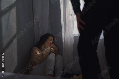 Scared woman sitting on ground and crying in fear of domestic violence.