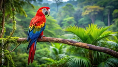 Scarlet macaw perched on branch in rainforest parrot POV