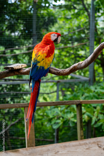 Scarlet macaw perched on branch in tropical enclosure surrounded by lush greenery