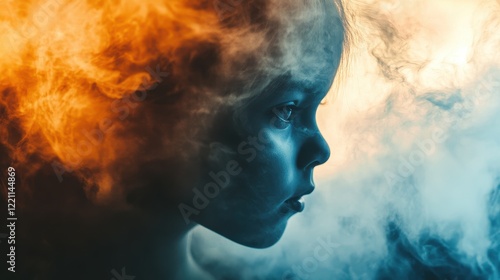 Scary child face in industrial smoke close up focus on copy space haunting vivid hues double exposure silhouette with pollution theme..