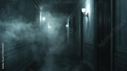 Scary dark misty corridor featuring an ominous atmosphere with limited visibility Perfect for horrorthemed designs or creating suspenseful settings