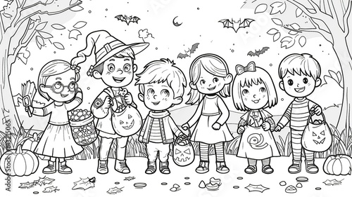 Scary Halloween coloring page with pumpkins, ghosts, bats and witches. Perfect for children and adults to enjoy.