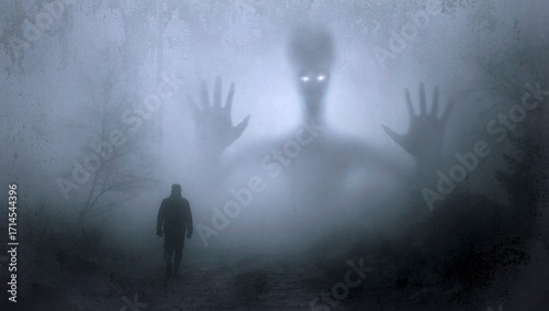 Scary Monster in Foggy Forest, horror scene with a man encountering a giant alien or ghost in the dark mist