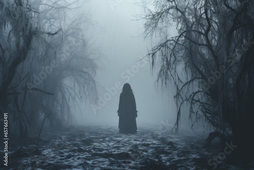 scary person stands in the fog in the forest