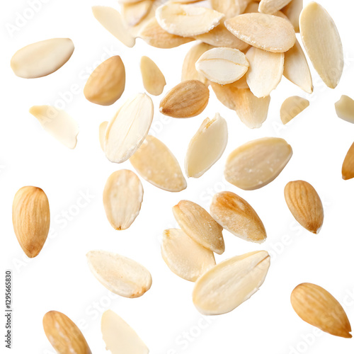Scattered Almond Slices with Light Floating Motion. Perfect for: Baking Advertisements, Health Campaigns, Nut-Based Recipes
