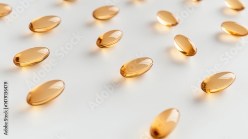 Scattered amber-colored softgel capsules on white background.