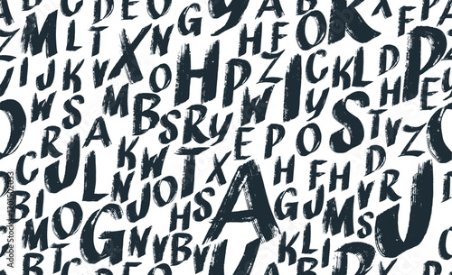 Scattered black letters alphabet seamless pattern. Grunge paint texture. Stamp typography banner. Bold font with dry brush. Childish style abc letters. Vector hand drawn typography seamless pattern.