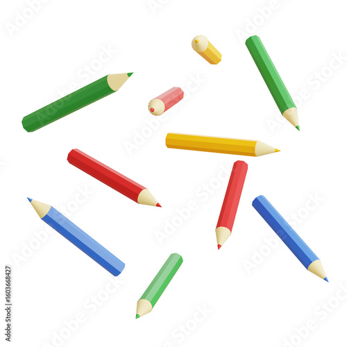 Scattered colored pencils in green, red, yellow, and blue, isolated on white background, perfect for art projects, drawing, or school supplies.
