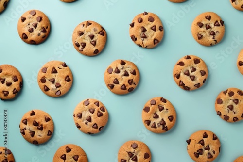 Scattered Delicious Chocolate Chip Cookies on Blue Background. Generative ai