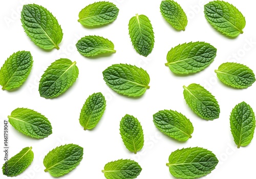 Scattered fresh green mint leaves arranged on a white background in a repeating pattern design