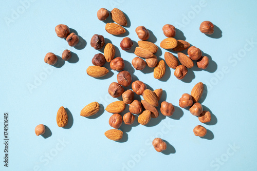 Scattered nuts hazelnuts and almonds on blue background flat lay top view. Food background. Tasty healthy snack, appetizer. Peeled nut kernels, dried fruit. Space for text