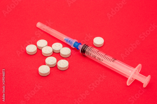 Scattered tablets and single-use syringe, 2 ml in volume against a red background.