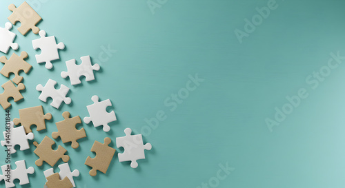 Scattered White and Brown Jigsaw Puzzle Pieces on Light Blue Textured Table Background