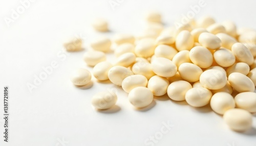 Scattered white beans against pure white backdrop, dry beans, white, close up