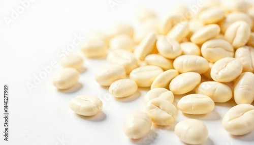 Scattered white beans against pure white backdrop, minimalist, nutrition