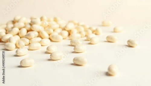 Scattered white beans against pure white backdrop, studio, macro