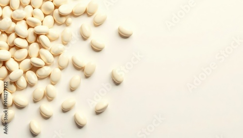 Scattered white beans forming a textured pattern against a pure white backdrop, simple, studio shot