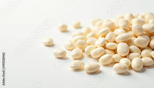 Scattered white beans on pristine white background, plant-based, protein, clean