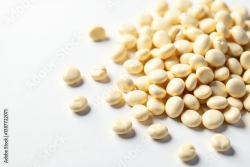 Scattered white beans on pristine white background, texture, culinary, healthy