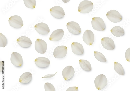Scattered white flower petals create a delicate and minimalist pattern on a clean white background