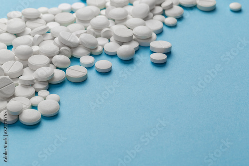 scattered white pills on a blue table. Layout for special offers such as advertising or other ideas. The concept of medicine, pharmacy and healthcare. Space for copy. flat lay for text or logo.