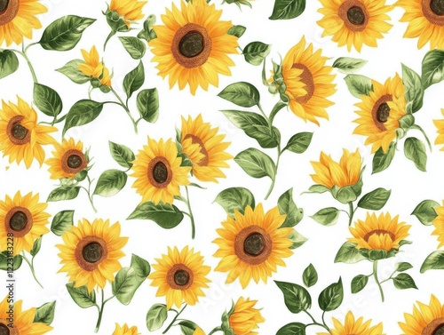 Scattered Yellow Sunflowers with Brown Centers and Green Leaves on a Clean White Background