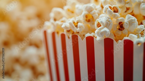 Scattering delicious popcorn from red striped box on pastel yellow background with copy space