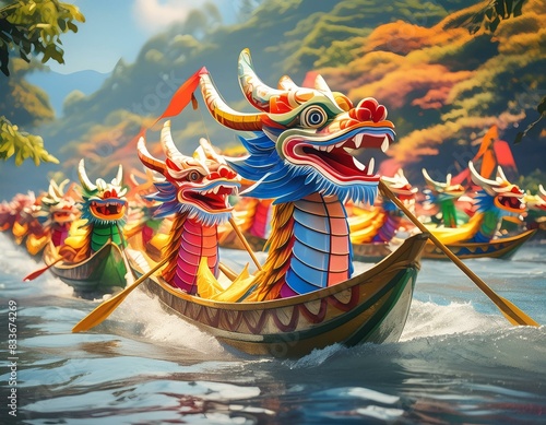 Scene of a competitive boat racing in the Dragon Boat Festival with colorful dragon boats