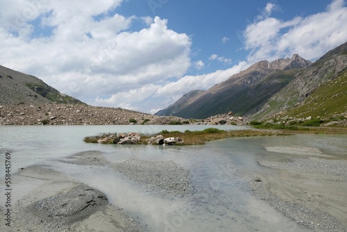 Scenery of Tian Shan Mountains during trekking in Altyn Arashan Valley to glacier. Little lake at foot of glacier. Karakol National Park. Kyrgyzstan, Central Asia