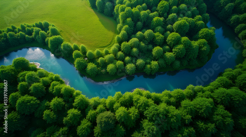 Scenic Aerial View Lush Green Forest Winding River Nature