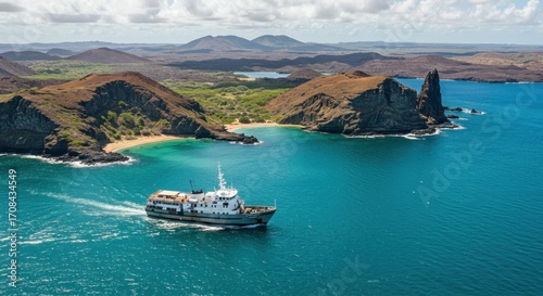 Scenic Aerial View of a Ship Sailing Near Rugged Coastline and Lush Green Islands