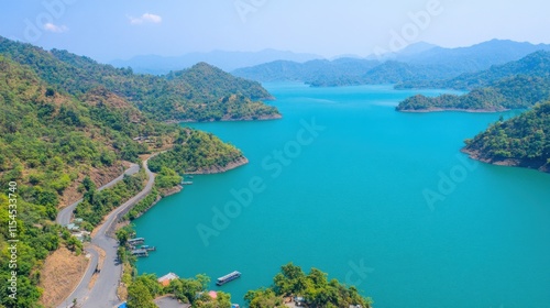 Scenic Aerial View of Serene Blue Lake Surrounded by Lush Green Mountains