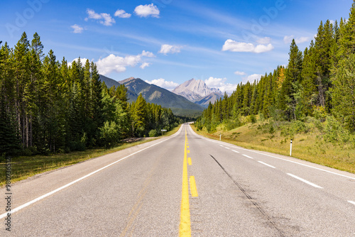 Scenic Alberta Highway Through Lush Forest and Majestic Mountains Under Clear Blue Sky