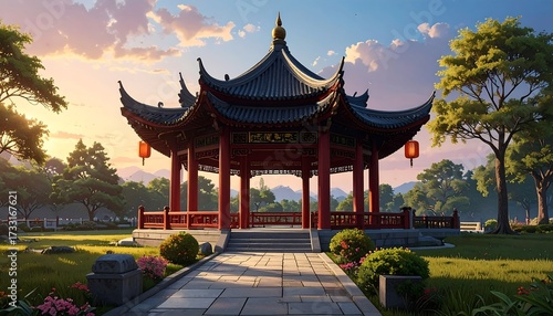 Scenic Asian Pavilion Amidst Lush Greenery Under a Dramatic Sunset Sky