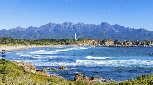 Scenic coastal view featuring lighthouse, mountains, and waves crashing on shore, evoking tranquility and natural beauty
