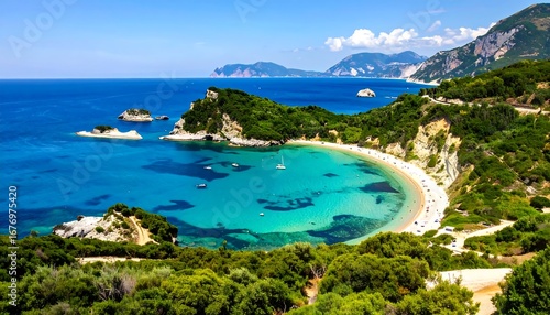 Scenic coastal view of a serene beach with clear waters and distant mountains under a blue sky