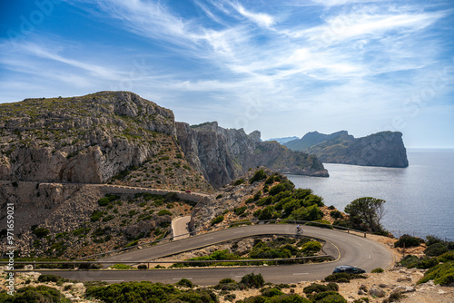 Scenic coastal view of winding road along rocky cliffs overlooking the Mediterranean Sea in Mallorca, Spain, under a bright blue sky.