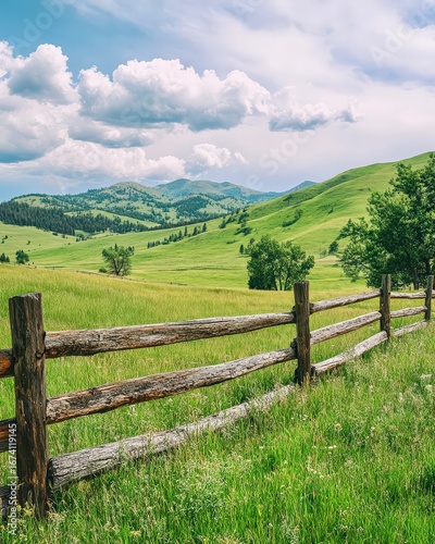 Scenic countryside landscape with wooden fence under blue sky, green hills, peaceful nature, rural charm, outdoor travel inspiration