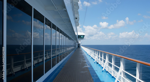 Scenic Cruise Ship Deck with Blue Railing Reflective Windows and Open Ocean Under a Partly Cloudy Sky