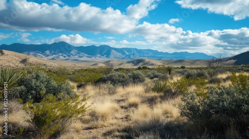 Scenic Desert Landscape with Mountains and Cloudy Blue Sky A Beautiful View
