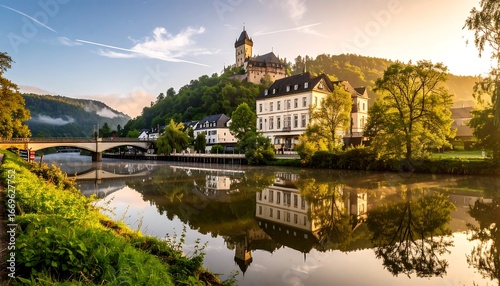 Scenic European Town with Castle and River Reflection at Sunrise.