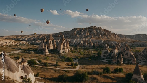 Scenic Flight Over Cappadocia’s Majestic Terrain with Drifting Balloons Creating a Magical View