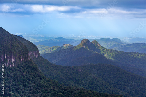 Scenic forested hills and cliffs in Springbrook National Park, Queensland, Australia