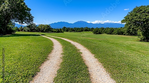 Scenic Gravel Path Winding Through Lush Green Meadow Towards Majestic Mountains
